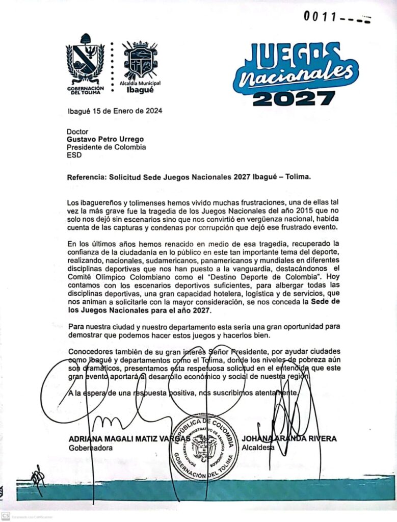 “Le solicitamos al presidente, Gustavo Petro, que Ibagué sea declarado como la sede de los juegos nacionales 202. Es muy importante no solo para el desarrollo de Ibagué, sino para para el Tolima, porque queremos que algunas sedes queden en algunos municipios del departamento. Pero también pensamos en temas importantes en materia de movilidad, deporte y cultura , prensando siempre en la gente por encima de cualquier cosa; con la alcaldesa queremos trabajar articuladamente para traerle desarrollo y progreso a la ciudadanía”, dijo Adriana Magali Matiz.
