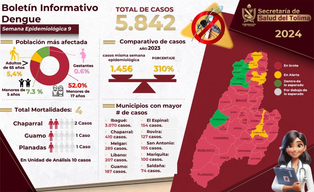 Hoy los 10 primeros municipios donde se concentra el mayor número de casos son: Ibagué, Chaparral, Melgar, Líbano, Rovira, Guamo, El Espinal, San Antonio, Mariquita y Saldaña. Los grupos de edades más afectados son entre 6 y 17 años y menores de 5 años.