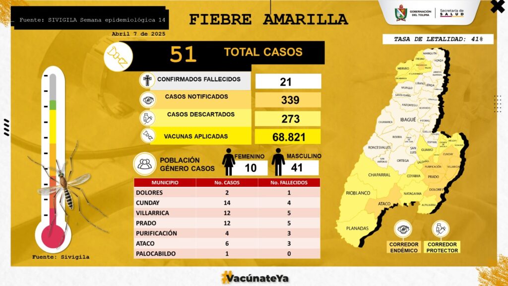 “Acá el llamado es a la conciencia de cada tolimense, que no debemos esperar que la fiebre amarilla toque nuestra familia; toque la puerta de nuestra casa o de nuestro municipio. Entender que hoy la solución la tenemos en nuestras manos y es la vacuna contra con una sola dosis de por vida. La amenaza tiene color y es fiebre amarilla”, indicó la funcionaria.