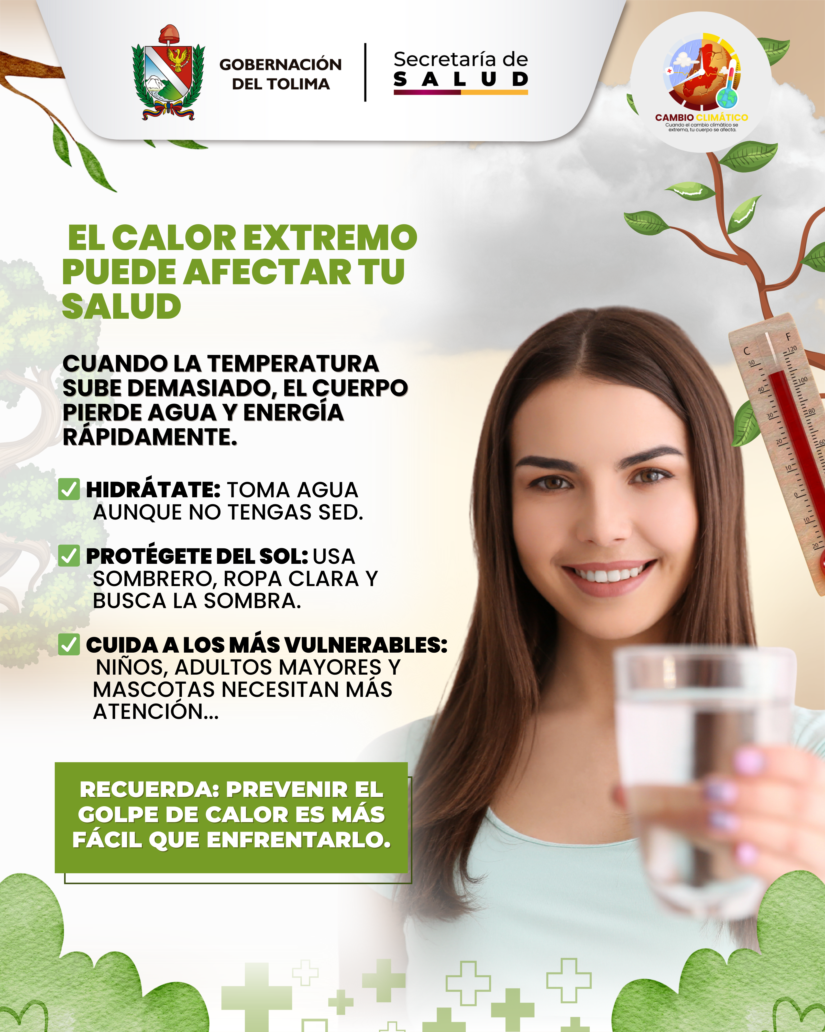 Ante las altas temperaturas que se registran en la ciudad de Ibagué y en el departamento del Tolima, se hace un llamado a la comunidad a fortalecer las medidas de autocuidado para prevenir enfermedades asociadas al calor y a la exposición solar.